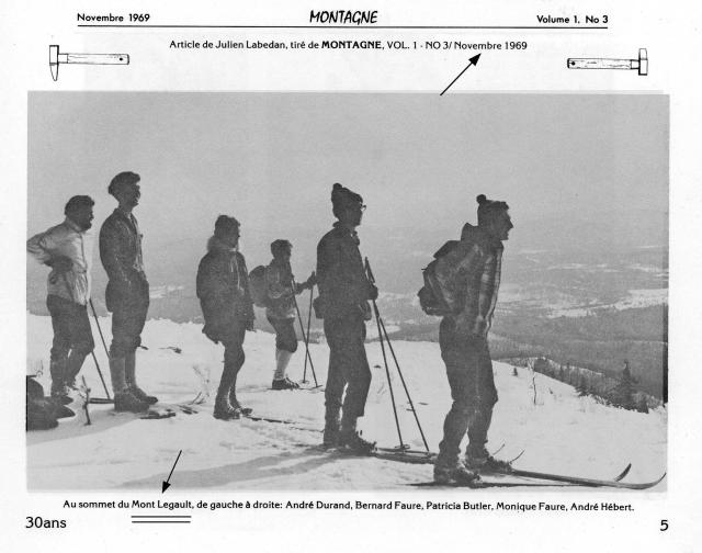 À gauche, assis: Michèle Benoît et Claude Soucy. Au centre, portant le dossard du CMC: François Rivest. À l’arrière, debout: Maurice Day et Paul Perreault, grand défricheur du sentier des Contreforts.